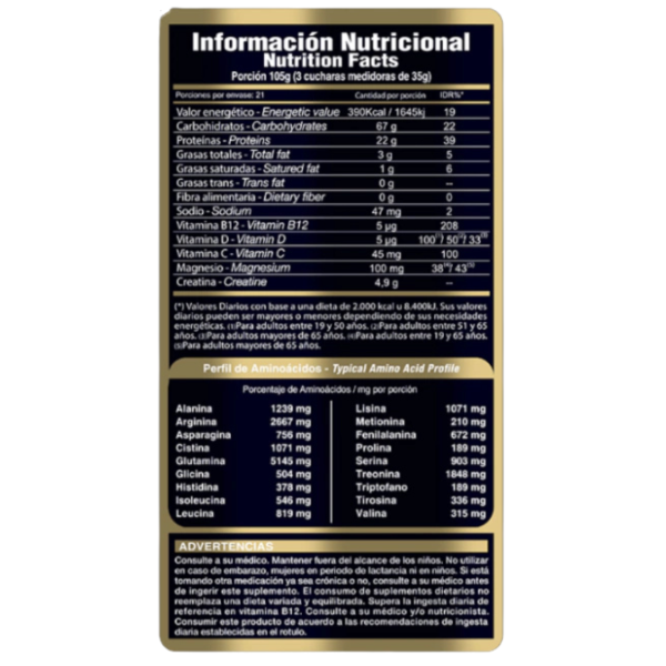 2268 GRAMOS | 21 SERVICIOS | 50 GRS. DE PROTEÍNA X SERV. | 90 GRS. DE CARBOHIDRATOS X SERV.
