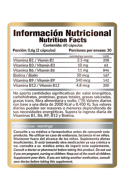 B-COMPLEX GOLD® es un compuesto de 6 vitaminas del grupo B que trabajan en forma sinérgica en la producción de energía.