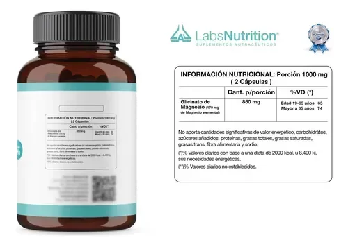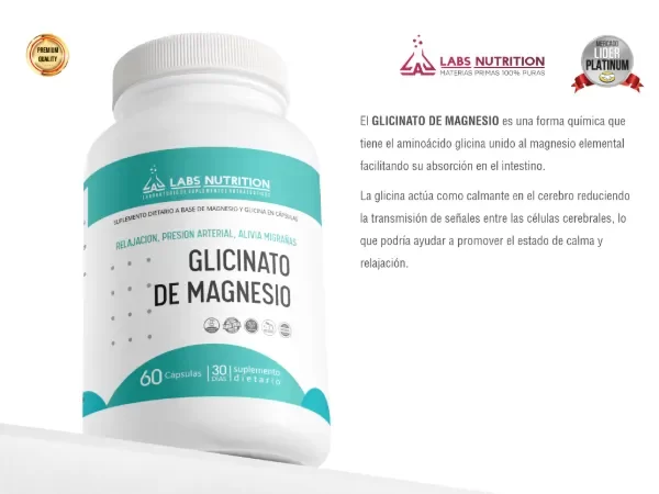 El Glicinato de Magnesio es una forma química de magnesio muy popular que tiene el aminoácido glicina unido al magnesio elemental facilitando su absorción en el intestino.