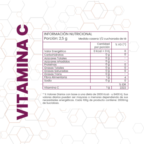 Vitamina C, ANAH: Celulosa microcristalina, ARO: Saborizante Naranja, EDU: Sucralosa. PUEDE CONTENER DERIVADOS DE LECHE Y DE SOJA.